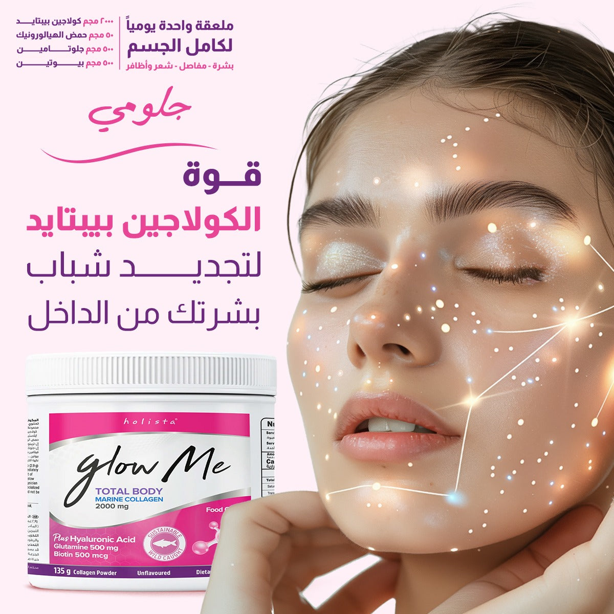 Holista Glow Me Marine Collagen Powder is a premium beauty and wellness supplement formulated to nourish your skin, hair, nails, and joints from within. Enriched with marine collagen, hyaluronic acid, L-glutamine, and biotin, this advanced blend promotes skin elasticity, reduces wrinkles, and supports overall vitality for a youthful, radiant glow.