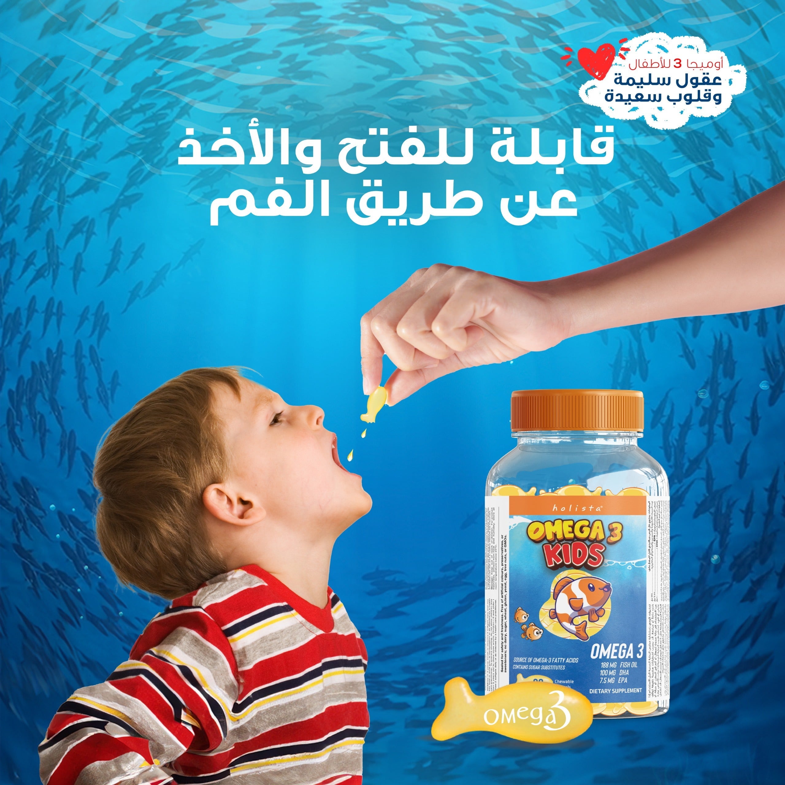 كبسولات هوليستا أوميغا 3 للأطفال تحتوي على 188 ملغ من الأحماض الدهنية أوميغا-3 (EPA وDHA) بنكهة البرتقال الطبيعية التي يحبها الأطفال. تُستخلص زيوت السمك المستخدمة في هذا المنتج من مصادر بحرية نقية تشمل الأنشوجة، الماكريل، السردين، والحرشف، لتقديم مزيج متوازن من أحماض أوميغا 3 عالية الجودة لدعم صحة الأطفال اليومية.