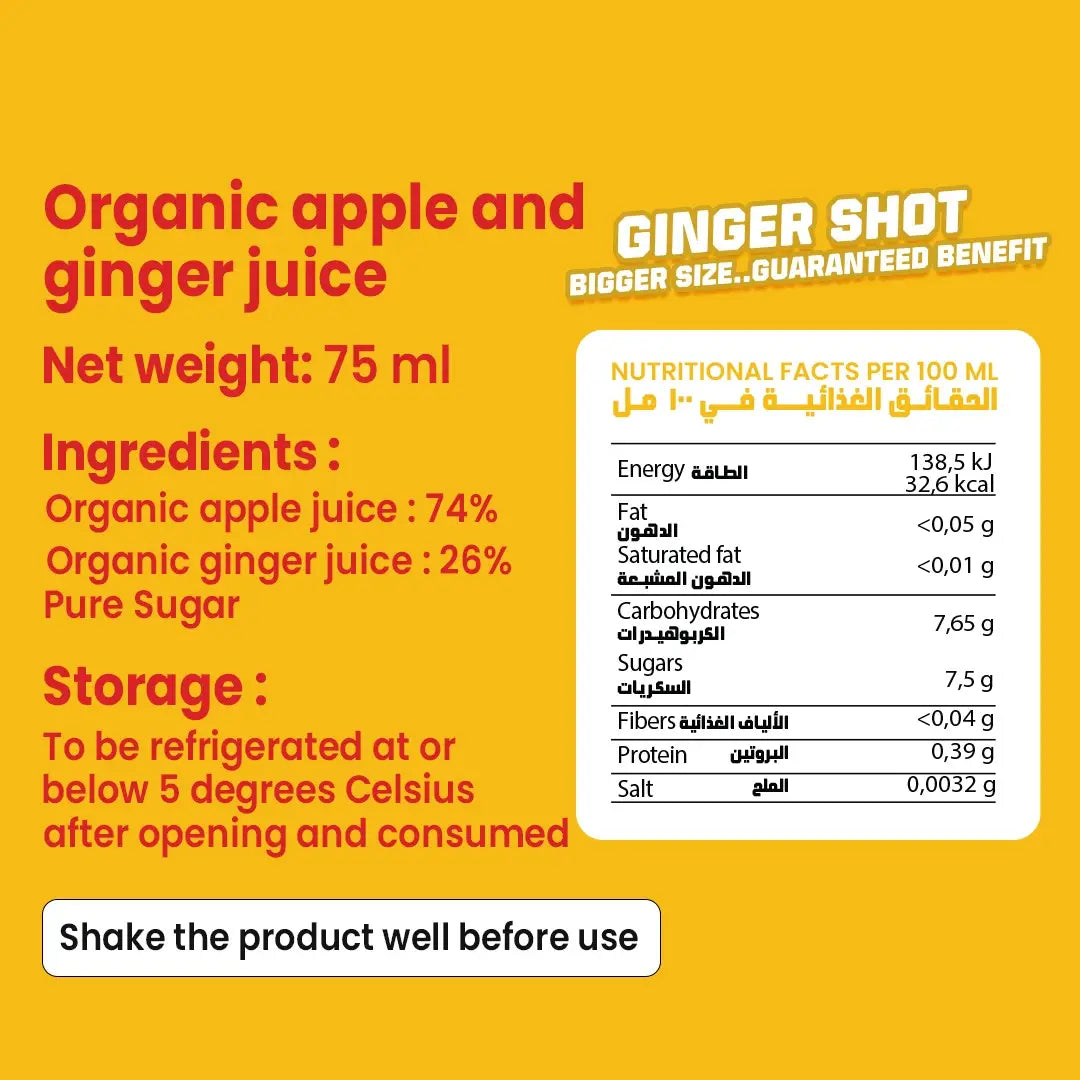 جرعة طبيعية ومركزة من المكونات العضوية الأساسية، تجمع بين توابل الزنجبيل والحلاوة الطبيعية لعصير التفاح. تم تعبئة هذا المنتج في زجاجة زجاجية كهرمانية سعة 75 مل، وقد صُمم هذا المنتج ليوفر تجربة تنشيطية ومُنشّطة. بفضل مذاقه الخفيف واللذيذ في آنٍ واحد، يُعد مشروب الزنجبيل باور شوت الرفيق المثالي لتعزيز روتينك اليومي ورفاهيتك.