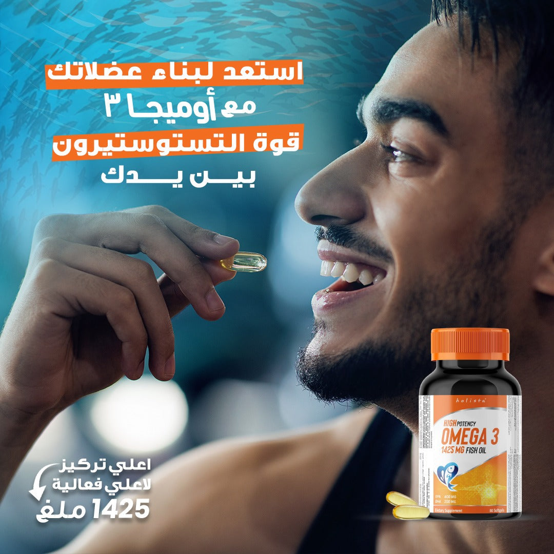 كبسولات هوليستا أوميغا-3 بتركيز عالي (1425 ملغ) هي مكمل غذائي ممتاز مصمم لدعم صحة القلب والدماغ والمفاصل. تحتوي كل كبسولة على 1425 ملغ من زيت السمك النقي المستخلص من الأنشوفة، الماكريل، والسردين، وتوفر 600 ملغ من EPA و300 ملغ من DHA — وهما أهم نوعين من الأحماض الدهنية الأساسية أوميغا-3.
