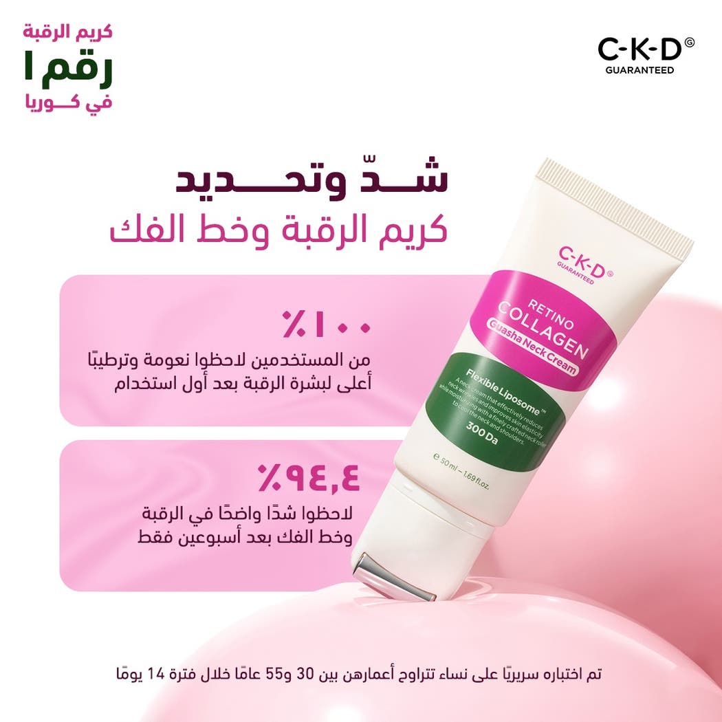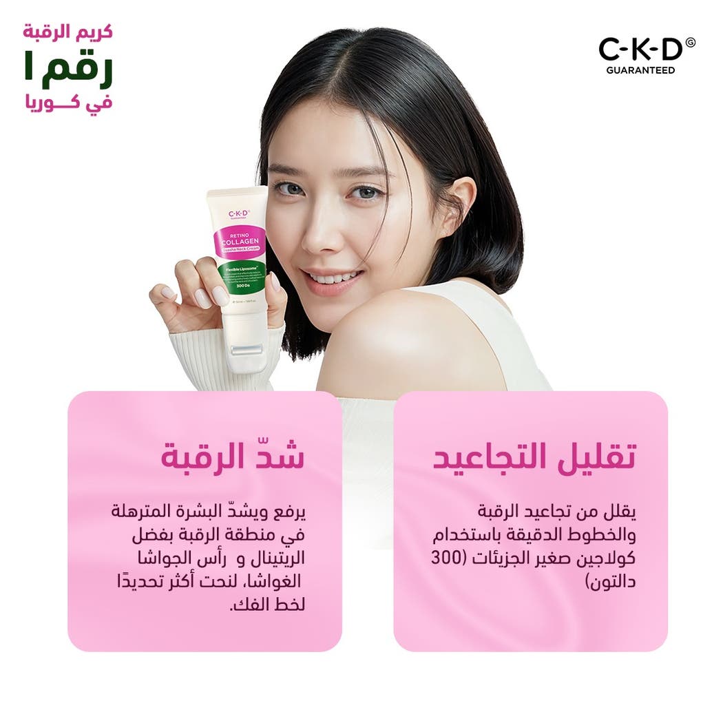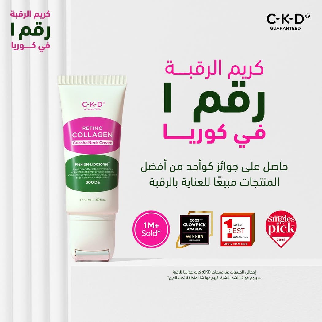 ارتقِ بعناية بشرتك مع سي كي دي ريتينو كولاجين صغير الجزيئات 300 جواشا كريم الرقبة – 50 مل، كريم الرقبة رقم 1 في كوريا والحائز على جائزة Glowpick لعام 2023 في فئة كريمات الرقبة/الليل، مع أكثر من مليون وحدة مباعة حول العالم.