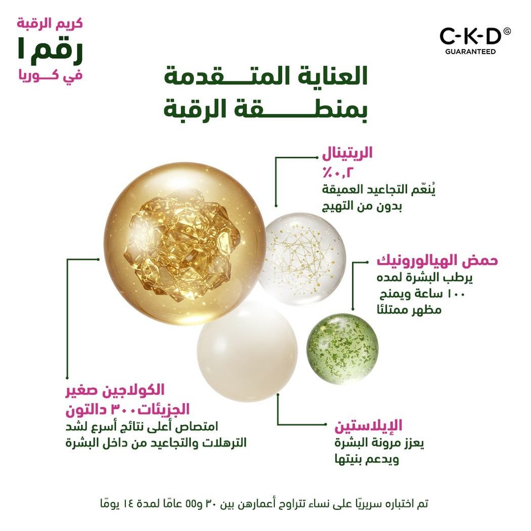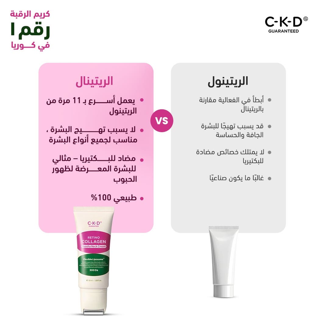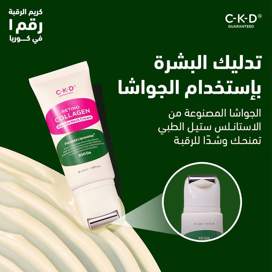 ارتقِ بعناية بشرتك مع سي كي دي ريتينو كولاجين صغير الجزيئات 300 جواشا كريم الرقبة – 50 مل، كريم الرقبة رقم 1 في كوريا والحائز على جائزة Glowpick لعام 2023 في فئة كريمات الرقبة/الليل، مع أكثر من مليون وحدة مباعة حول العالم.