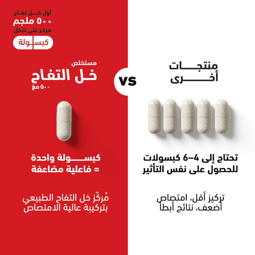 التركيبة: خل تفاح مركز بتركيز 500 ملغ