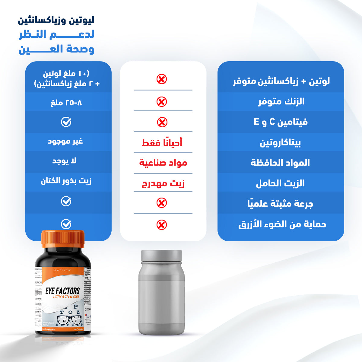 هوليستا عوامل العين هو مكمل غذائي متطور صُمم خصيصًا لدعم صحة العين والحماية من الانخفاض البصري المرتبط بالعمر. تحتوي كل كبسولة على مزيج تآزري من مضادات الأكسدة الطبيعية والكاروتينات التي تحافظ على الرؤية الصحية وتقلل من الإجهاد التأكسدي الناتج عن التعرض للشاشات والعوامل البيئية.