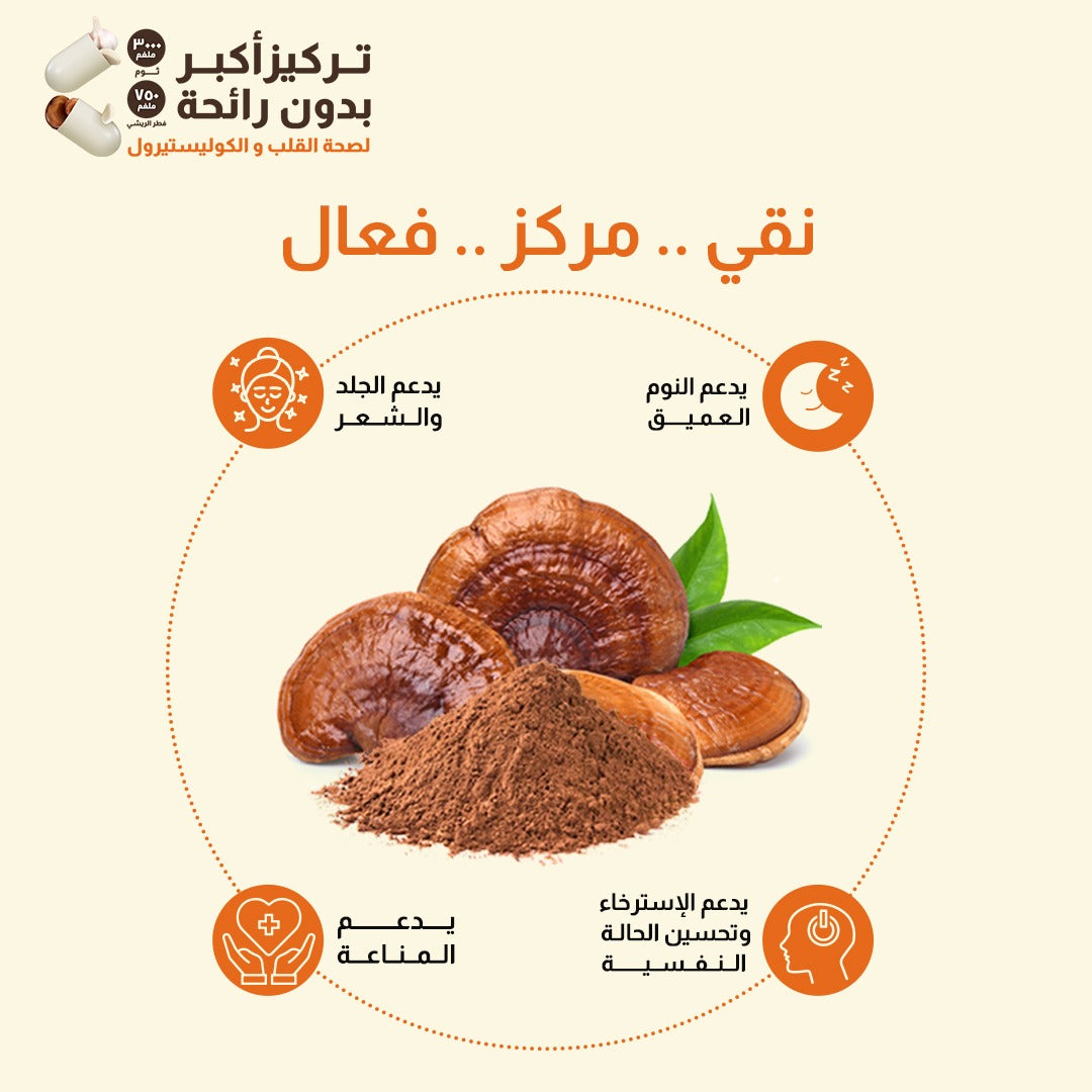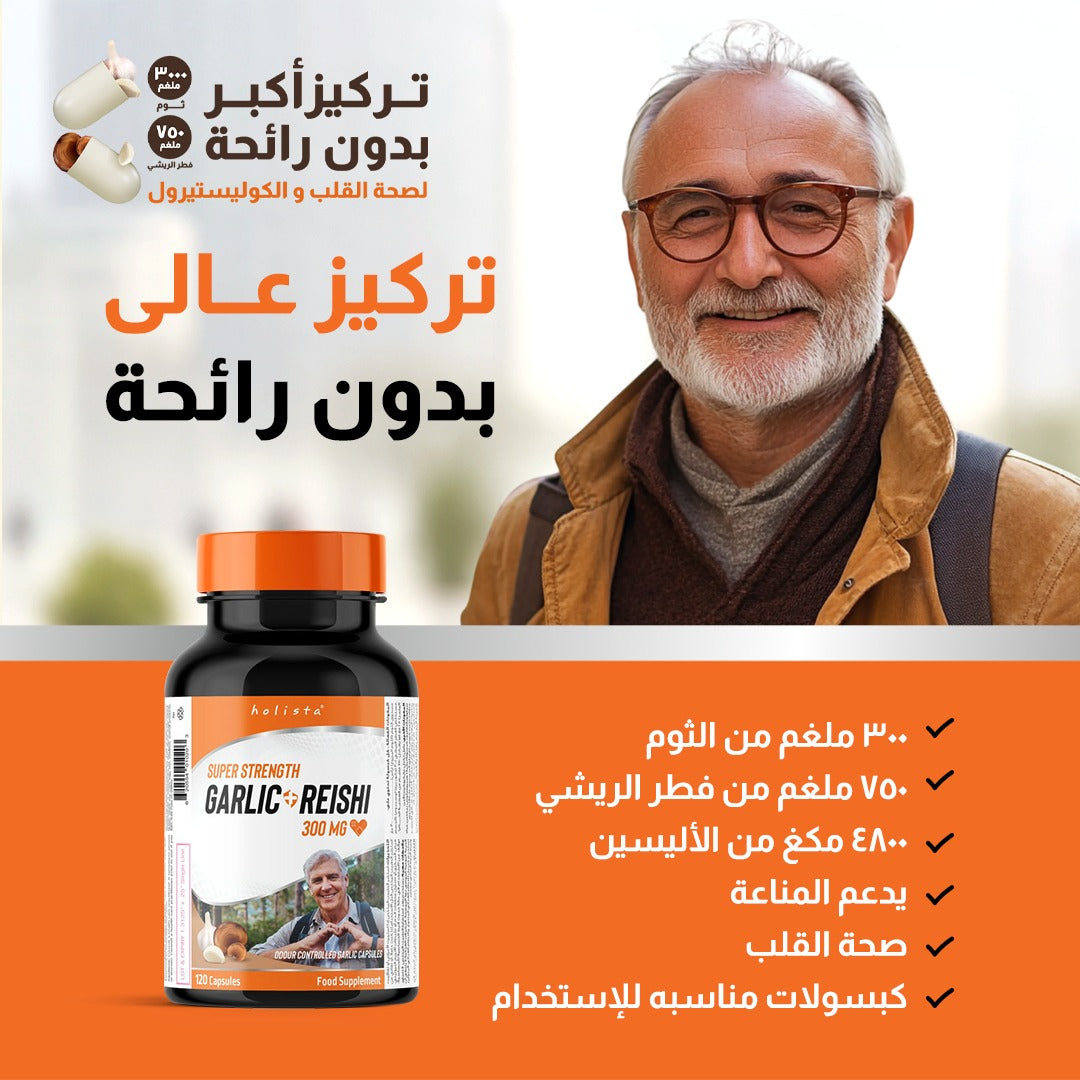 كبسولات هوليستا ثوم وريشي هي مكمل غذائي متقدم يجمع بين مستخلص الثوم المركز وفطر الريشي العضوي في كبسولات خالية من الرائحة ومتأخرة الإطلاق. توفر كل كبسولة قوة 3000 مجم من الثوم النيء و750 مجم من فطر الريشي المجفف، مما يدعم صحة القلب والأوعية الدموية ووظيفة المناعة والطاقة بشكل عام - دون مذاق أو رائحة الثوم الكريهة.