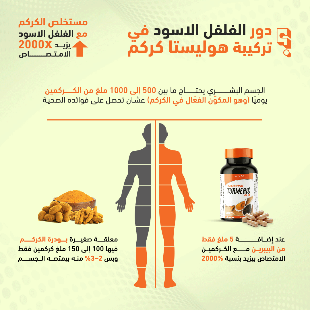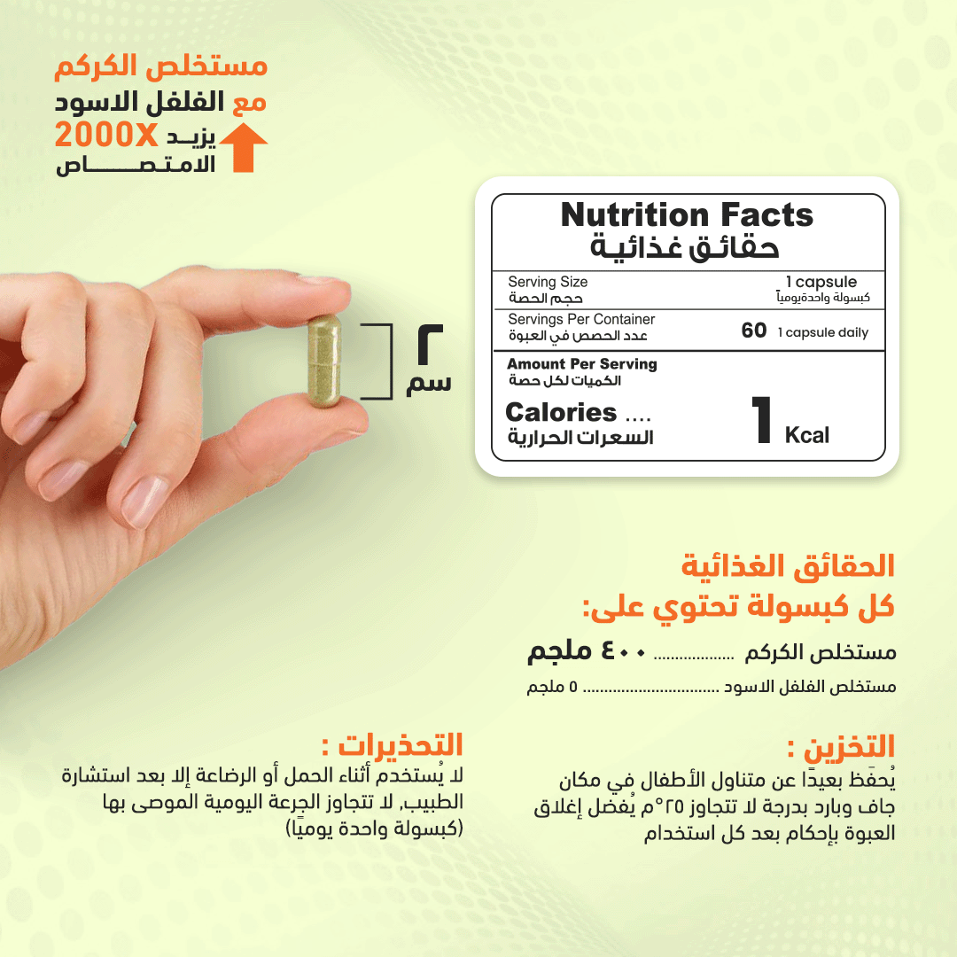 التركيبة: كركمين بتركيز 95% مدعم بالفلفل الأسود