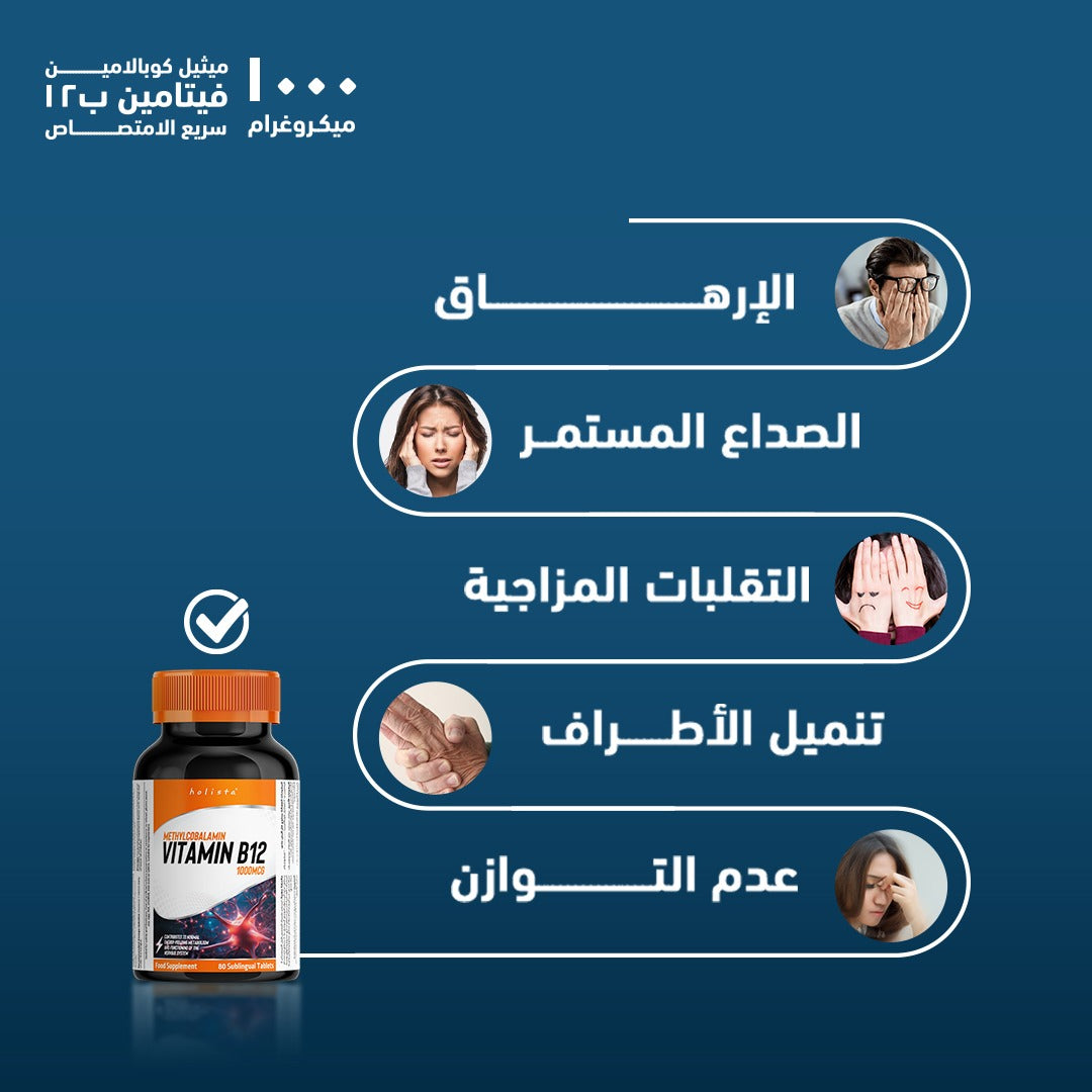 تساعد تركيبة هوليستا على تقليل التعب، وتحسين المزاج، ودعم وظائف الدماغ والذاكرة. كما تساعد في الحفاظ على صحة الأعصاب ومعالجة أعراض نقص ب12 الشائعة مثل التنميل، الدوخة، وتقلبات المزاج. مناسب للرجال والنساء على حد سواء — خاصة للنباتيين ولمن يعانون من ضعف امتصاص فيتامين ب12.