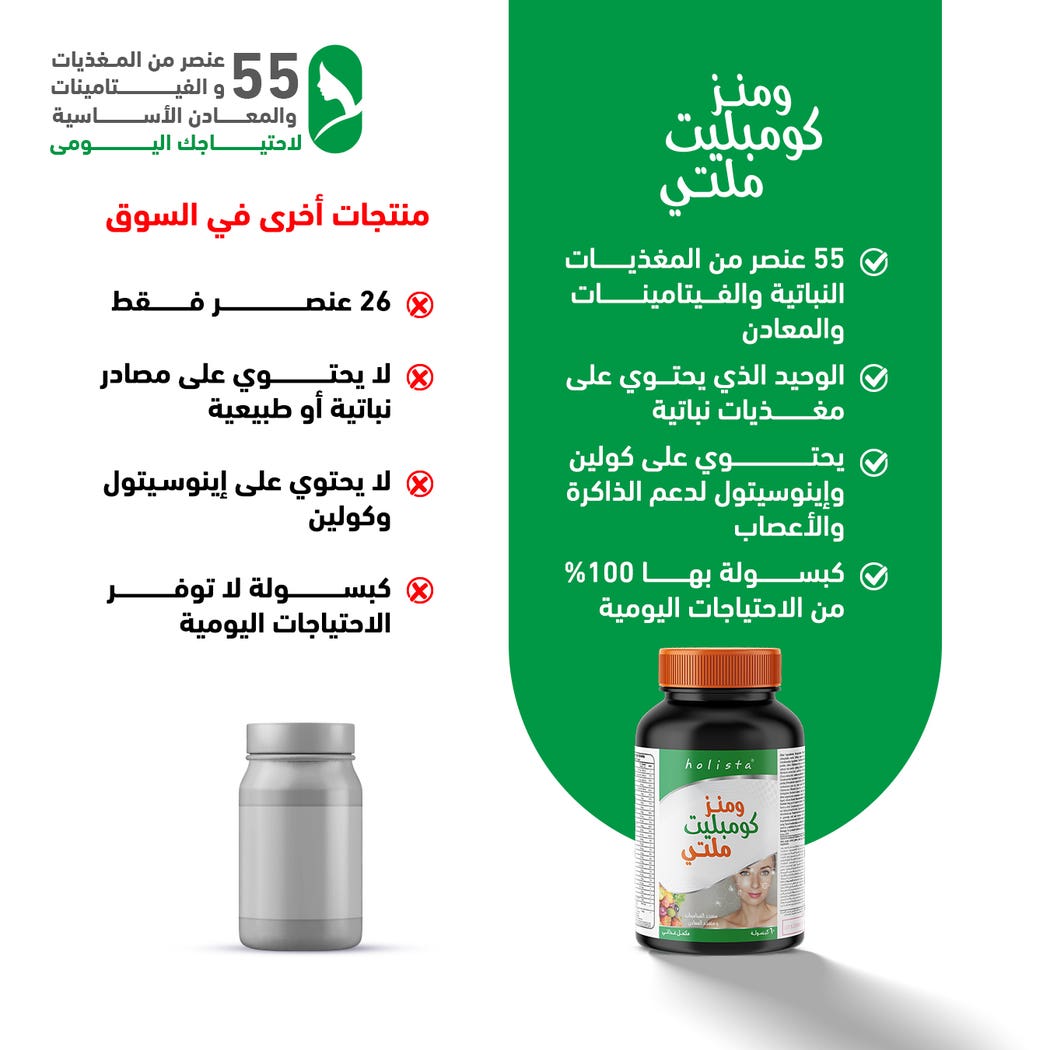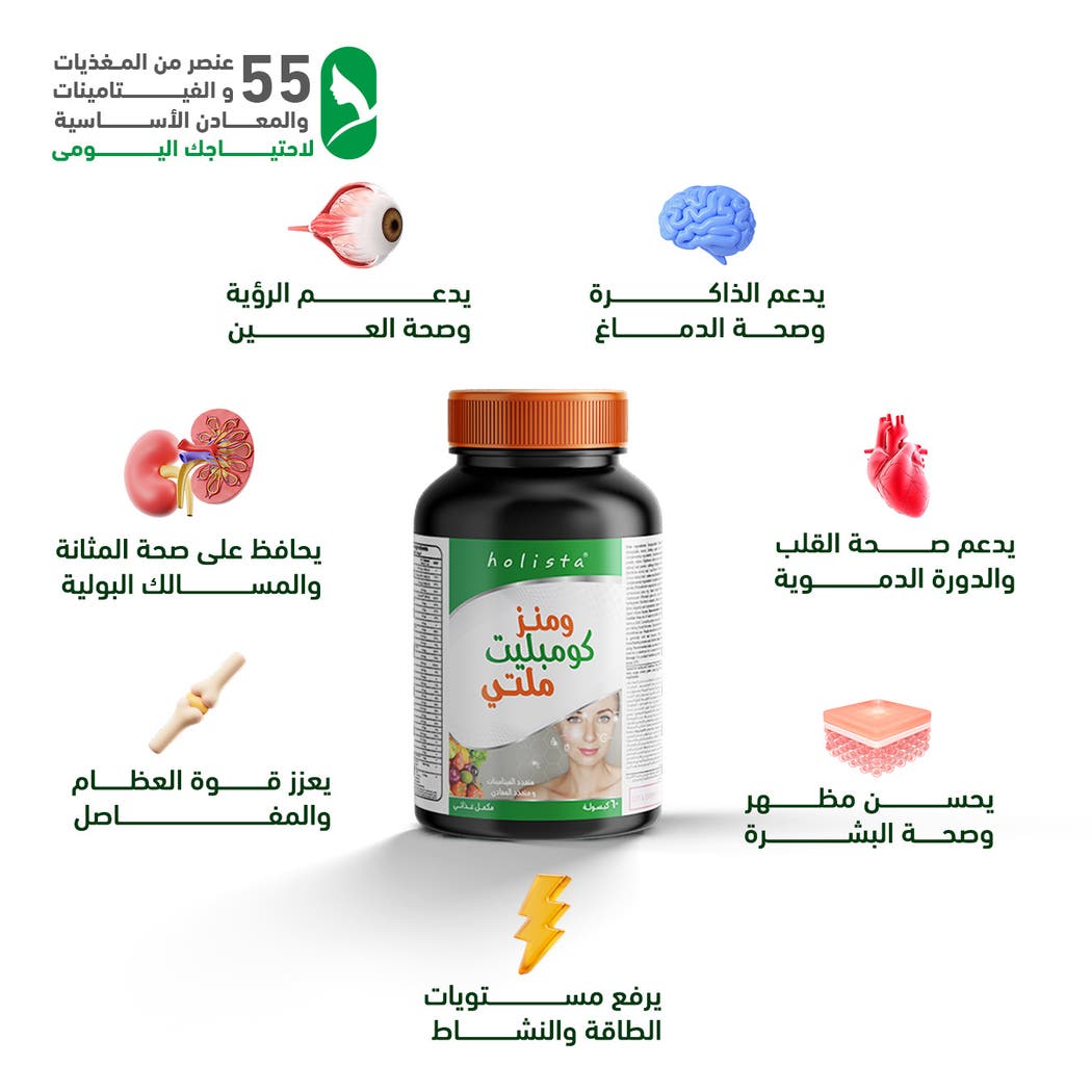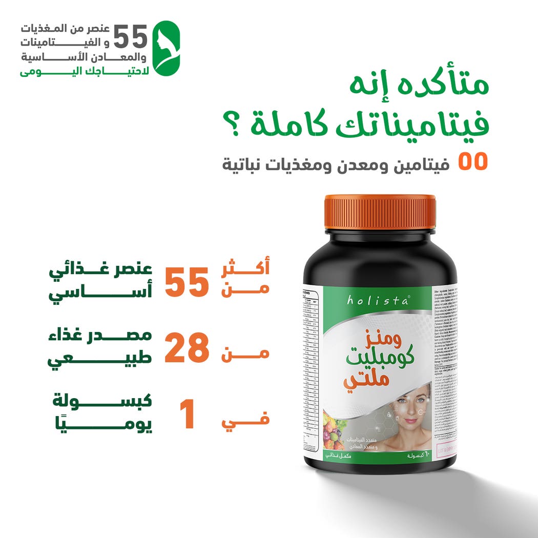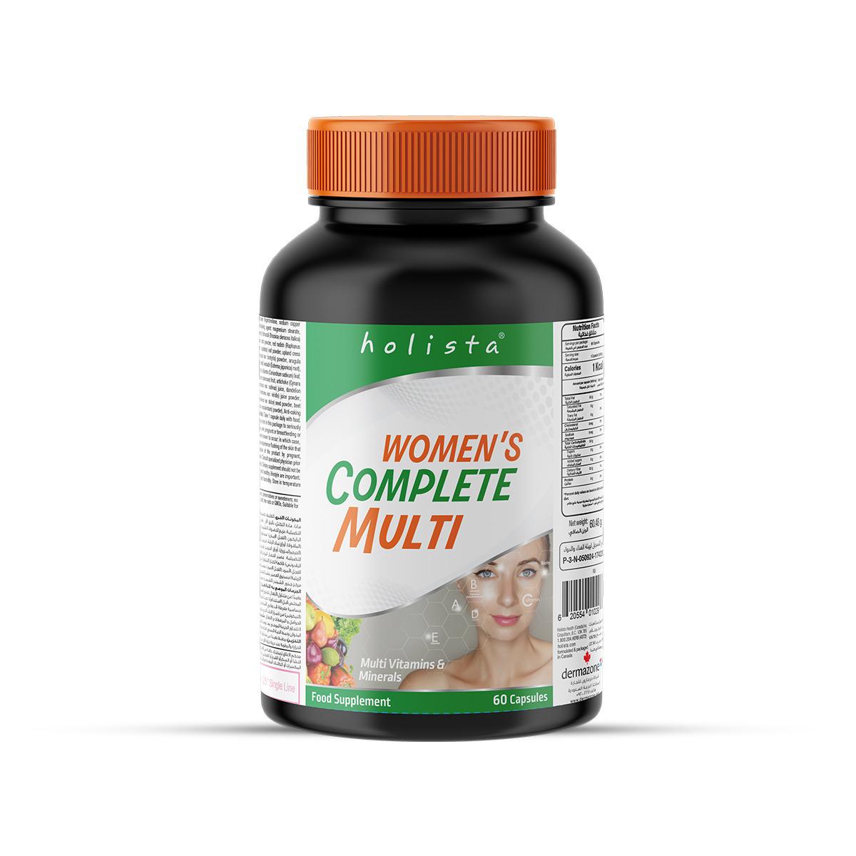 هوليستا وومنز كومبليت مالتي هو مكمل غذائي متكامل من الفيتامينات والمعادن، مصمم خصيصًا لتلبية الاحتياجات اليومية الغذائية للمرأة العصرية. تحتوي كل كبسولة على مزيج قوي من أكثر من 55 عنصرًا غذائيًا أساسيًا، تشمل الفيتامينات والمعادن ومستخلصات نباتية طبيعية، لدعم الطاقة والمناعة وصحة العظام والدماغ والبشرة والمسالك البولية.