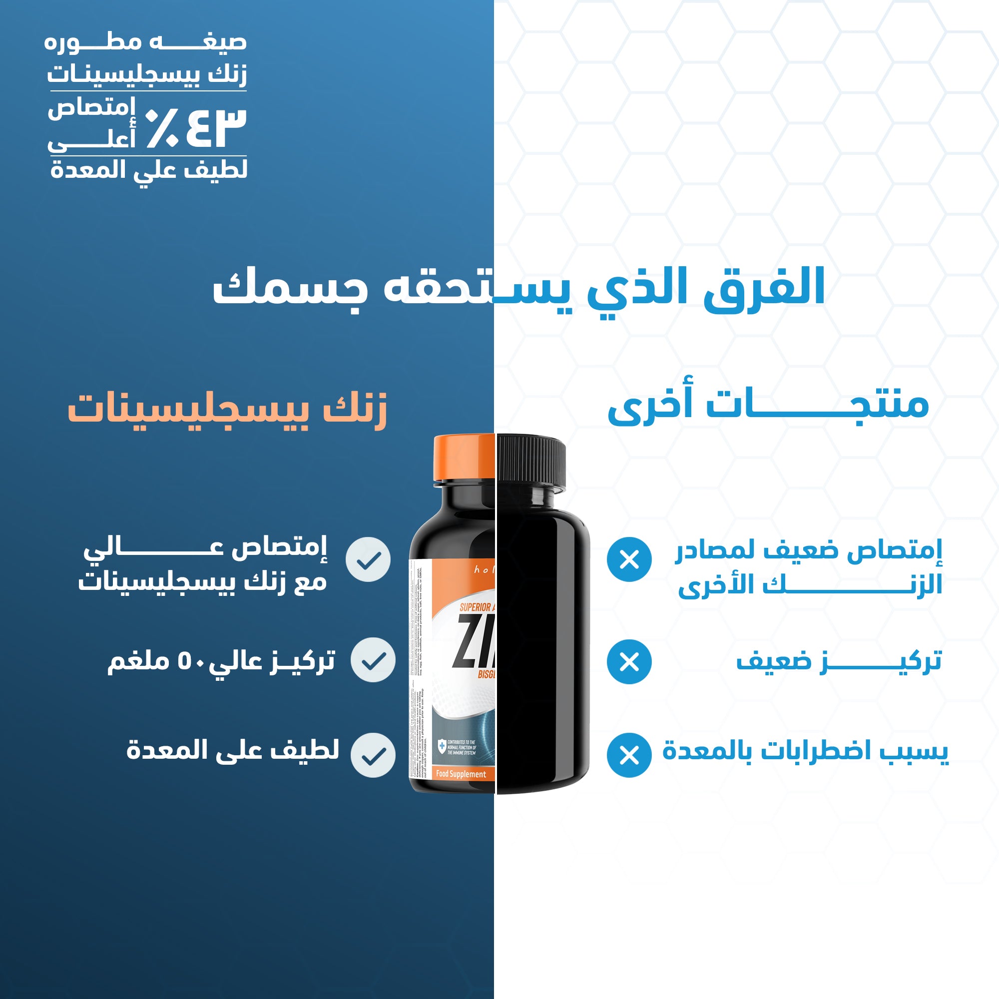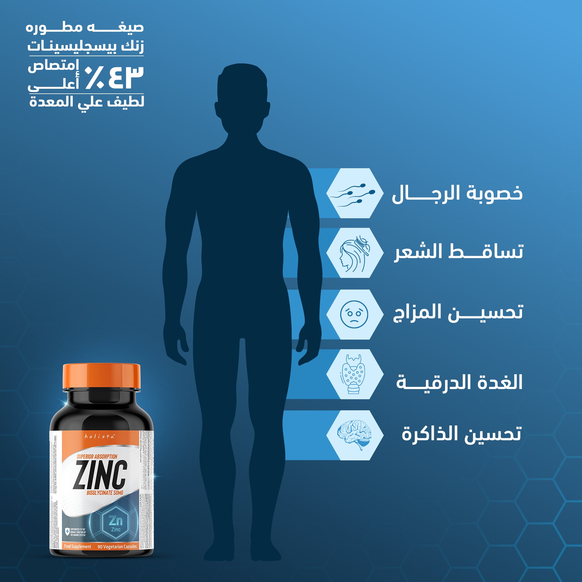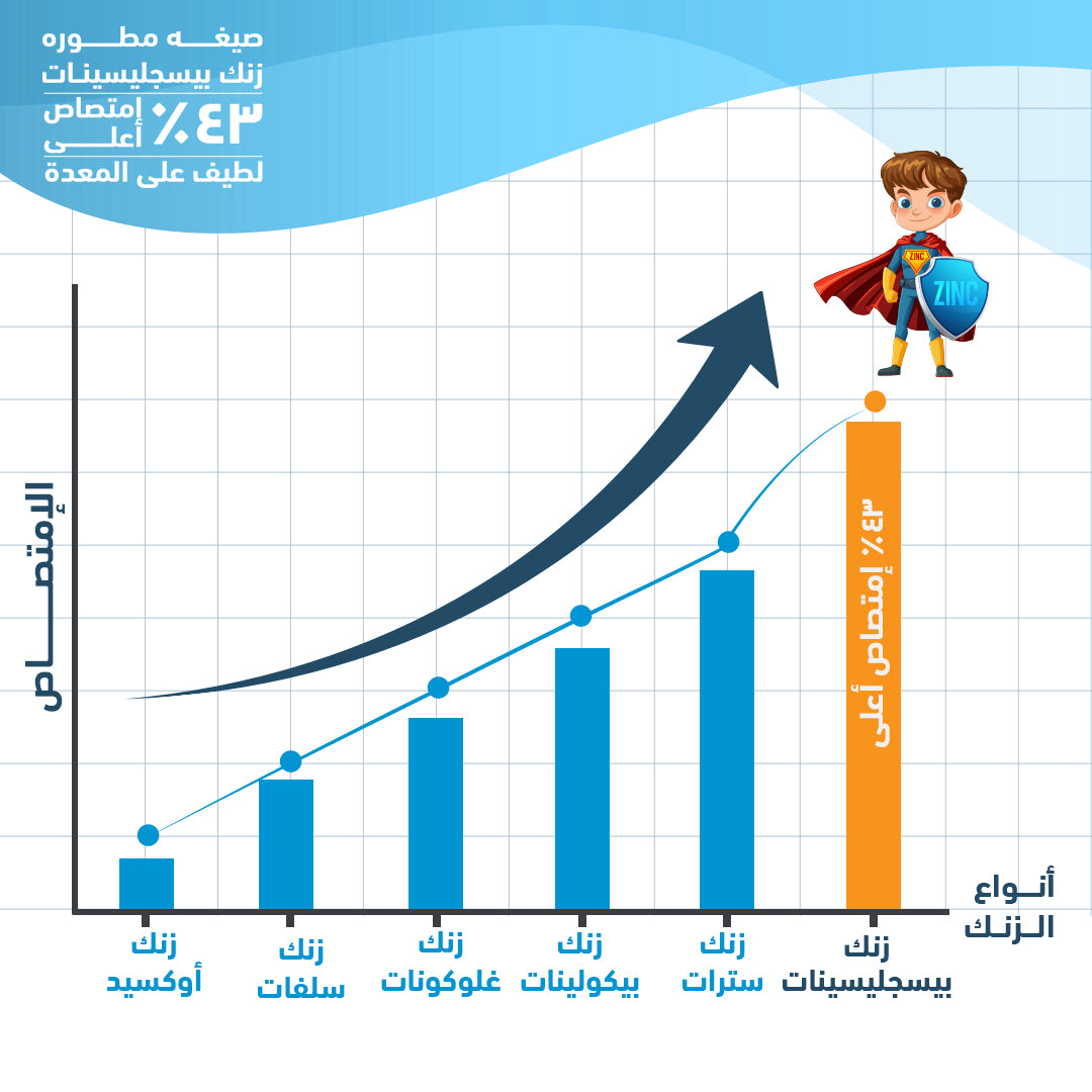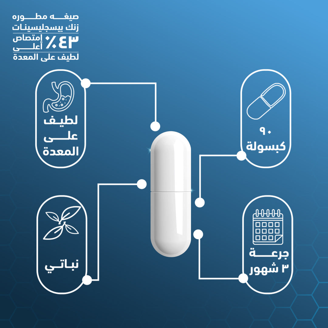 هوليستا زنك بيسغليسينات 50 مجم هو مكمل غذائي متطور وعالي الجودة يتميز بشكل متاح بيولوجيًا من الزنك (Bisglycinate Zinc) الذي يوفر امتصاصًا أعلى بنسبة تصل إلى 43٪ مقارنة بأشكال الزنك التقليدية. هذه التركيبة اللطيفة على المعدة توفر جرعة فعالة تبلغ 50 ملغ لكل كبسولة، مما يلبي 100٪ من الاحتياج اليومي الموصى به من الزنك.