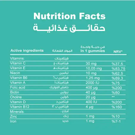تحتوي بريناتال جاميز على 12 من الفيتامينات والمعادن كالتالي: