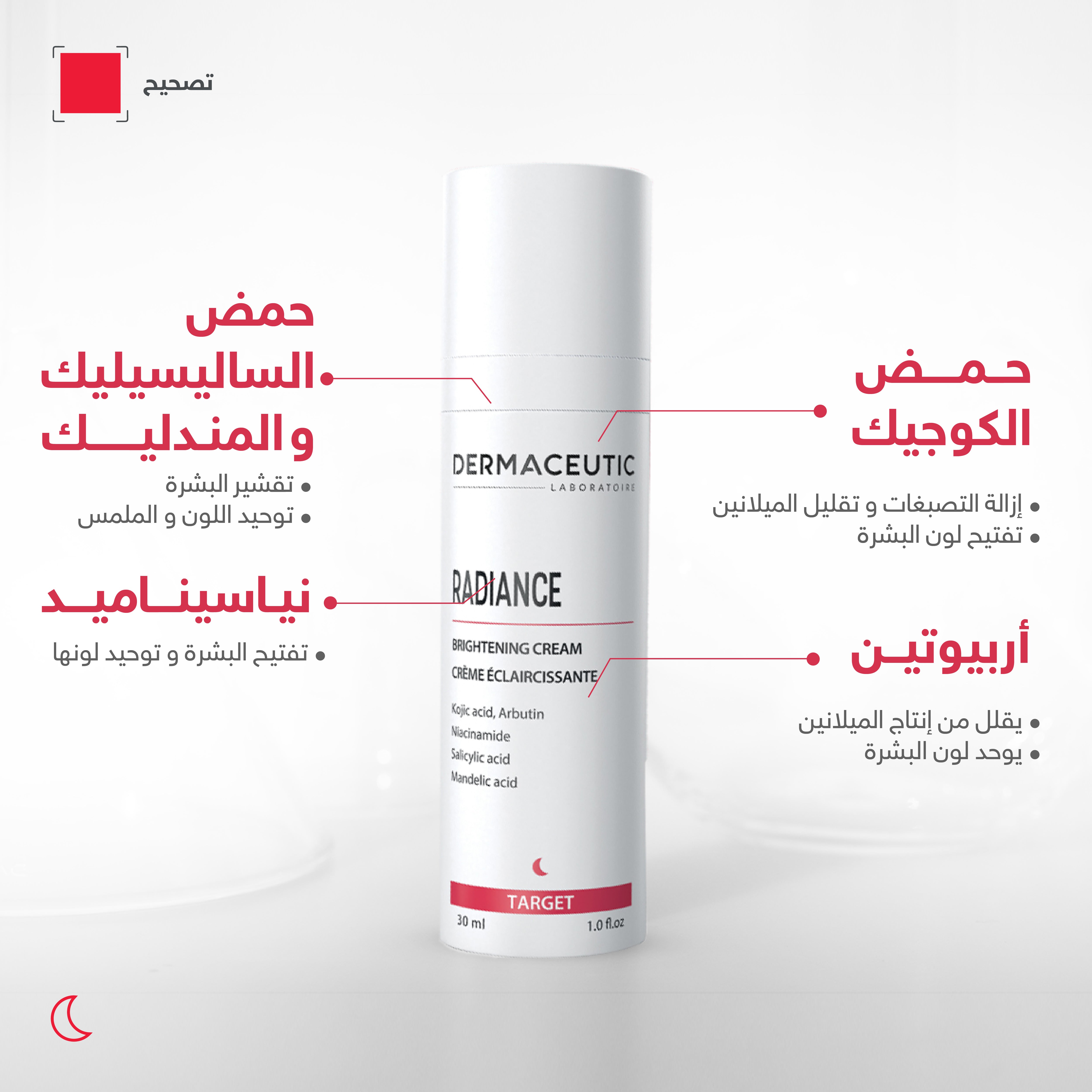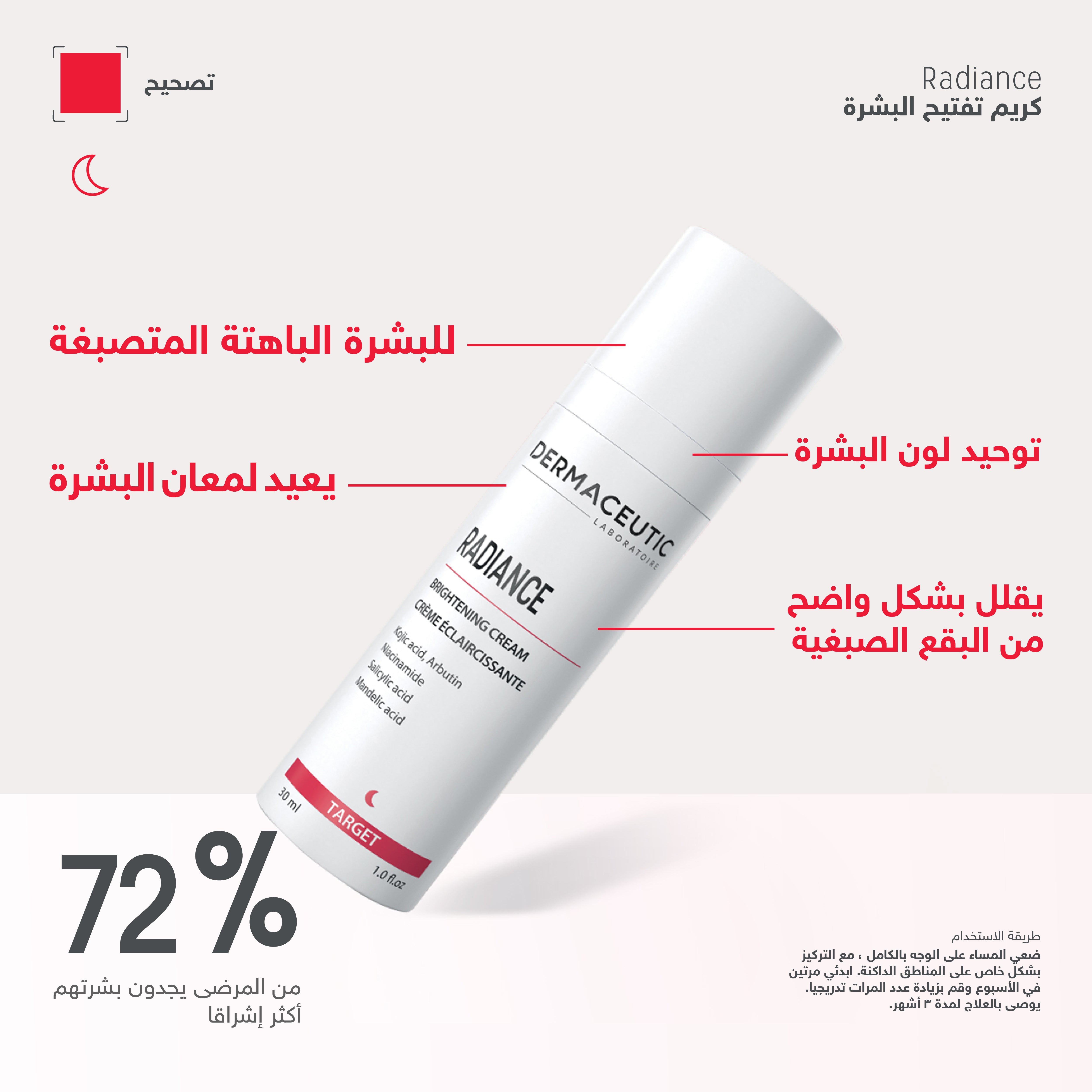 يُثبت كريم ديرماسيوتيك ريديانس لتفتيح البشرة فعاليته دائمًا في تقليل آثار التصبغات والبقع العنيدة وإزالة العديد منها؛ إذ يُعد كريم تقشير ليلي لطيف مكوّن من أحماض فعّالة تُعيد للبشرة الإشراق واللمعان الطبيعي، كما تُحسّن ملمس البشرة لتبدو أكثر تجانسًا، لذا فهو المنتج الأمثل للبشرة الباهتة وغير المتجانسة.